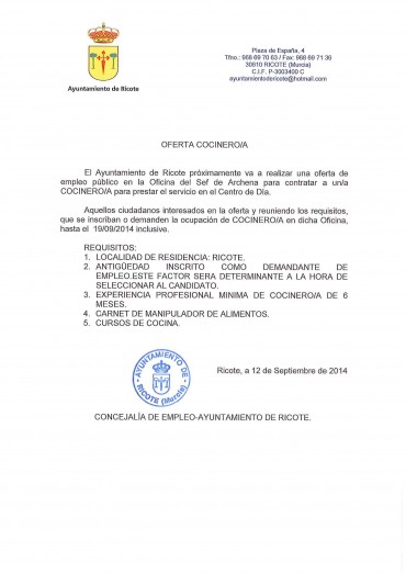 Formalización de matrícula del 17 de Mayo al 30 de Junio en el Ayuntamiento.