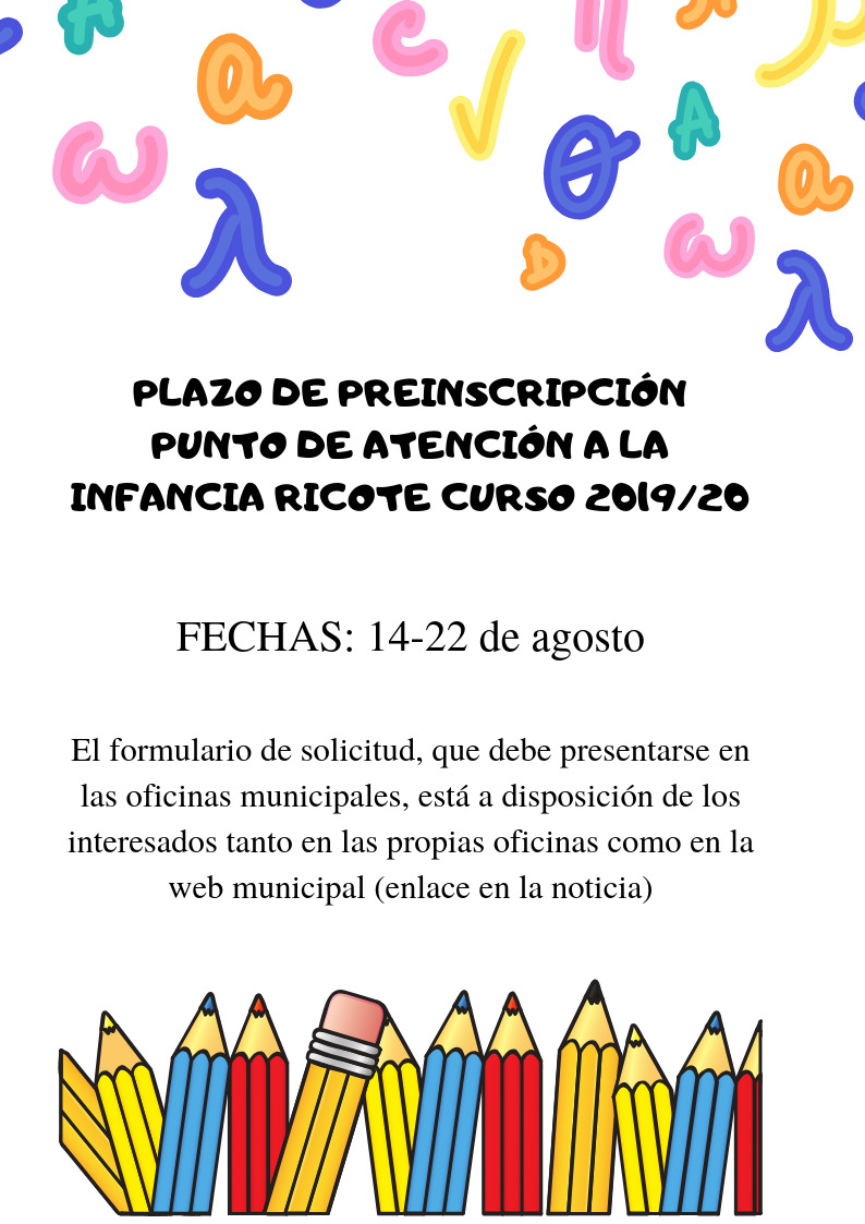 Para la pre-inscripción del curso 2019-2020, las familias deberán presentar su solicitud de manera presencial en el Ayuntamiento de Ricote.