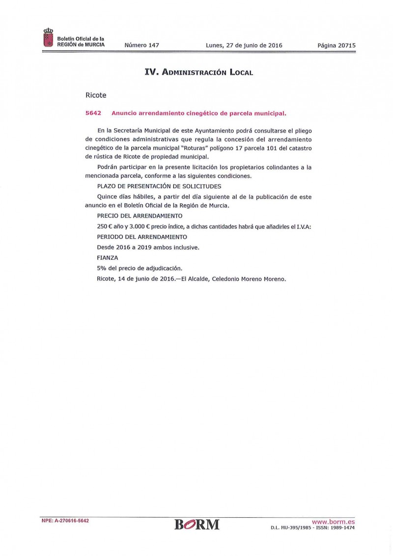 ANUNCIO ARRENDAMIENTO CINÉGETICO DE PARCELA MUNICIPAL.