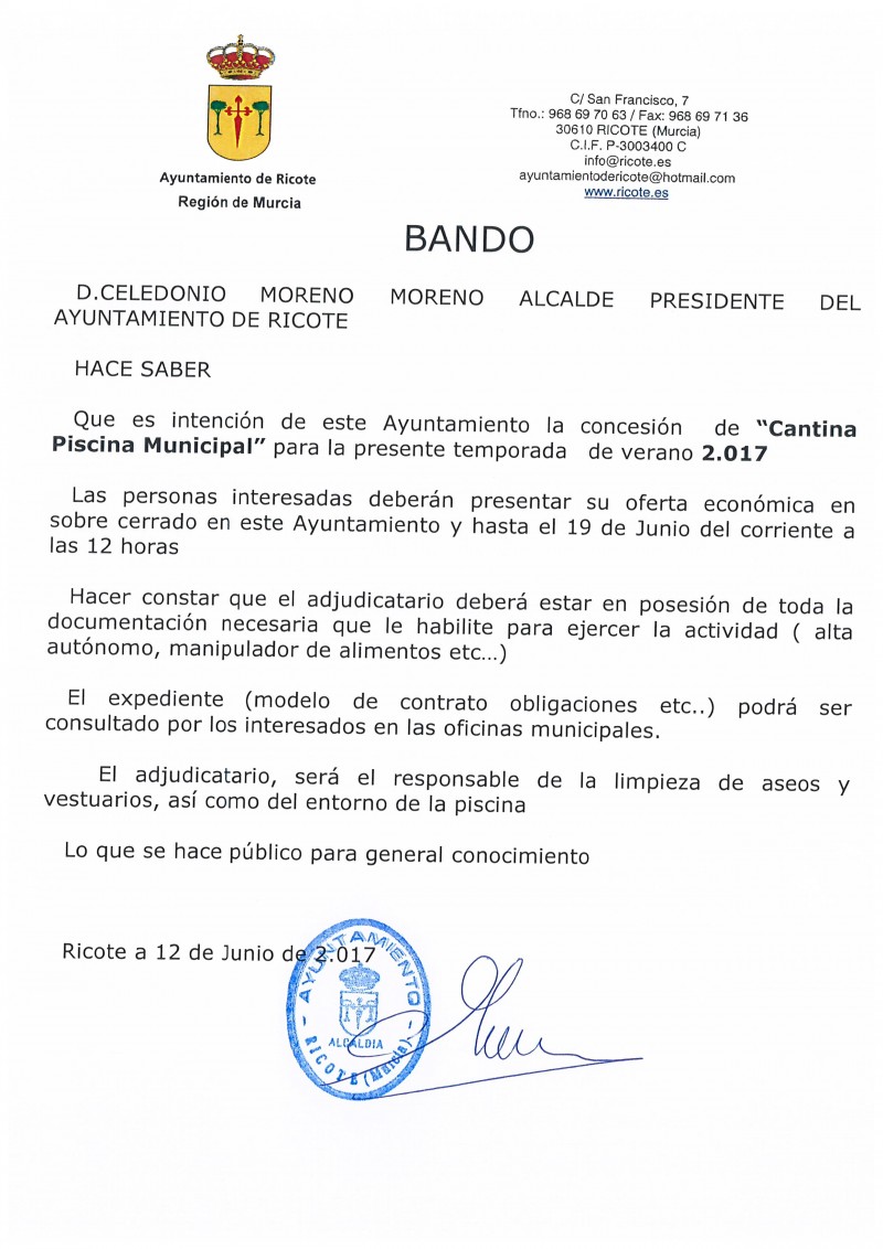 BANDO CONCESIÓN CANTINA PISCINA MUNICIPAL