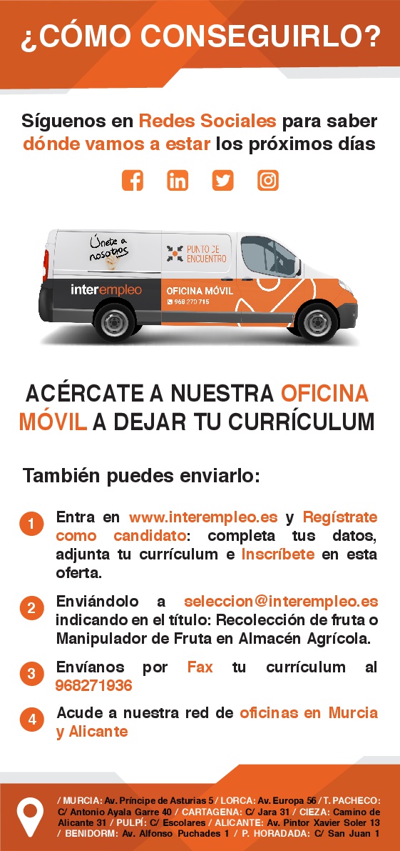 ¿BUSCAS TRABAJO? OFICINA MÓVIL EN RICOTE DÍAS: 2 Y 4 DE MAYO 2018 HORARIO: DE 9 A 13 HORAS. LUGAR: PARQUE HUERTO DE CELESTINO. Comparte en FacebookTweet
