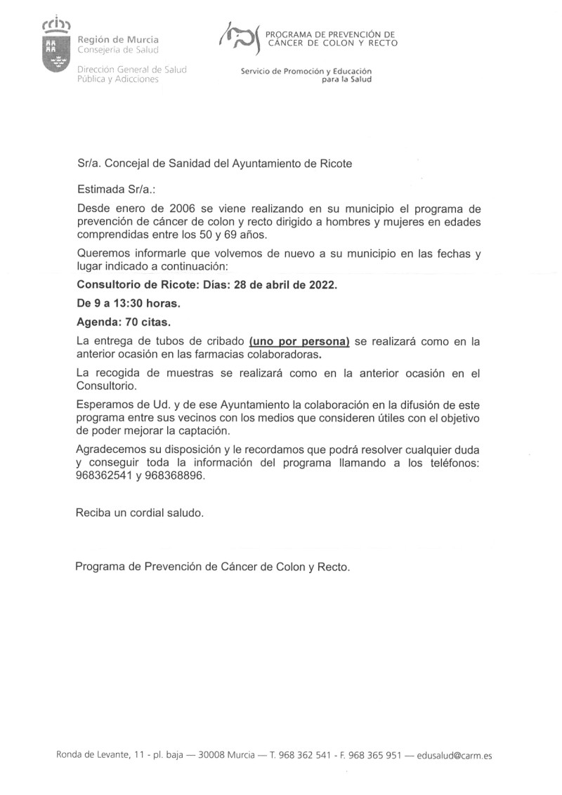 DIRIGIDO A HOMBRES Y MUJERES EN EDADES COMPRENDIDAS ENTRE LOS 50 Y 69 AÑOS CONSULTORIO DE RICOTE: 25 DE MAYO Y 1 DE JUNIO DE