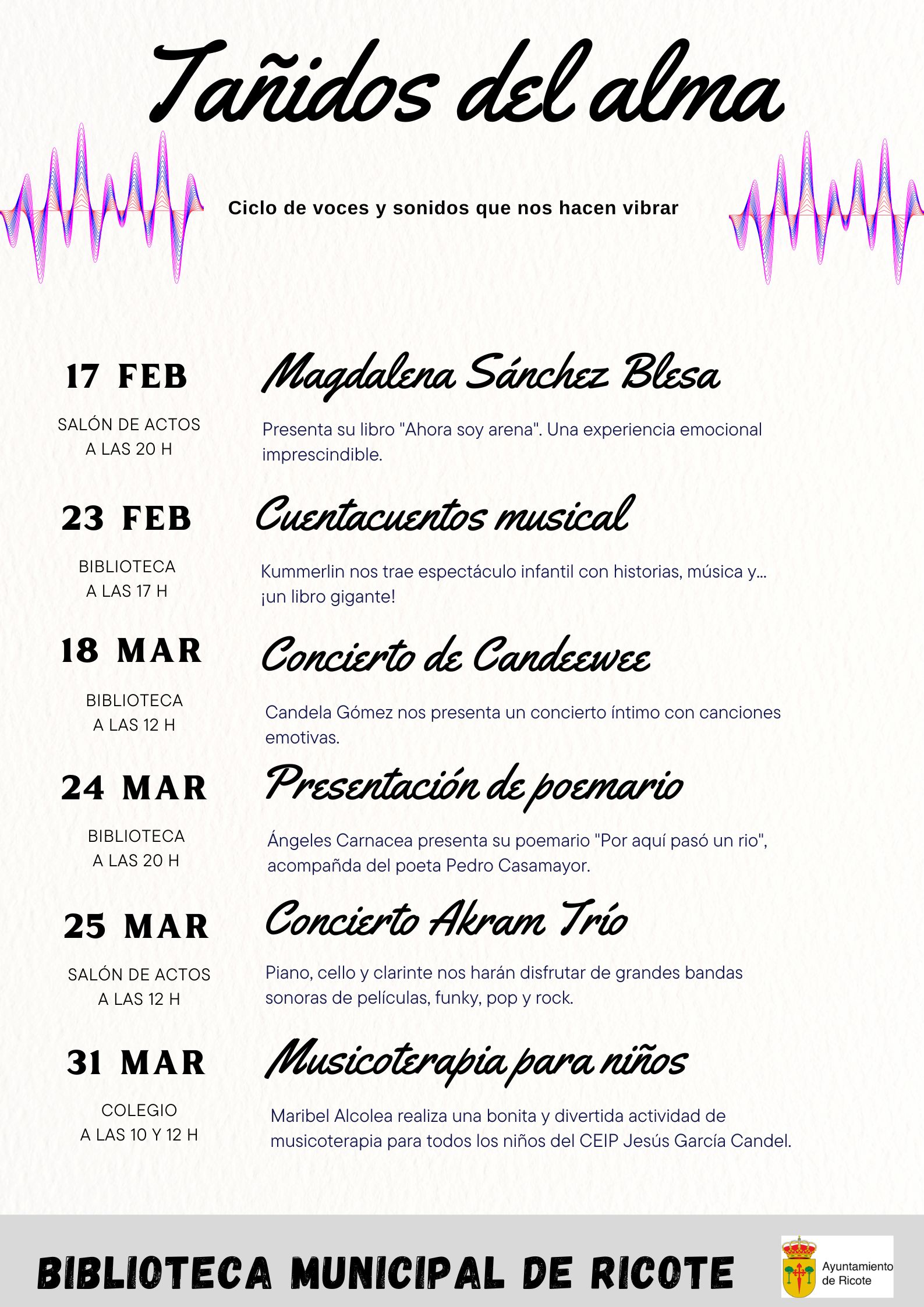 El Centro Cultural ha organizado “Tañidos del alma, un ciclo de voces y poesía que nos hacen vibrar.” Se trata de una serie de actividades que surgen de la necesidad de los protagonistas de expresarse, de manera que través de la palabra o de la música, nos conmueven. El título del ciclo viene de la acción de tañer, donde se activan las cuerdas (vocales) y los instrumentos para producir el sonido, y, asimismo, se relaciona con la manera en la que esto nos afecta y emociona haciéndonos vibrar, como las mismas cuerdas que han producido la emoción.