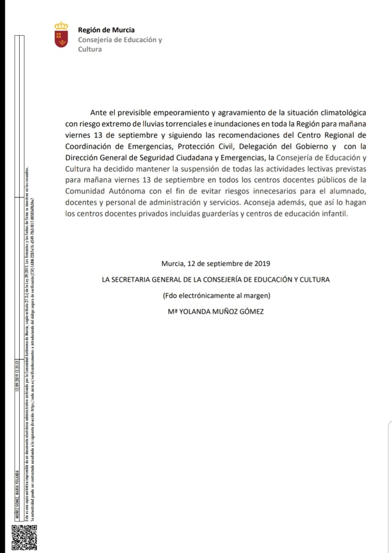 SE CANCELAN LAS CLASES ESCOLARES Y DE LA GUARDERÍA MUNICIPAL TAMBIÉN MAÑANA DÍA 13/09/19