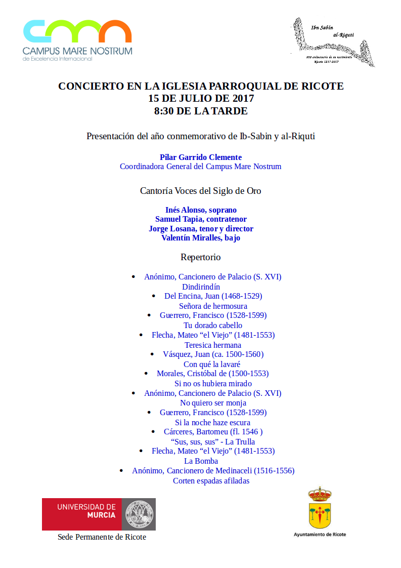 Uno de los actos centrales tendrá lugar el próximo 15 de julio, a las 20:30, en el templo parroquial de Ricote, gracias a la colaboración del Campus Mare Nostrum de la Universidad de Murcia, de la Sede Permanente y por supuesto de nuestro párroco que una vez más nos ha cedido generosamente el magnífico templo parroquial para este acto cultural.