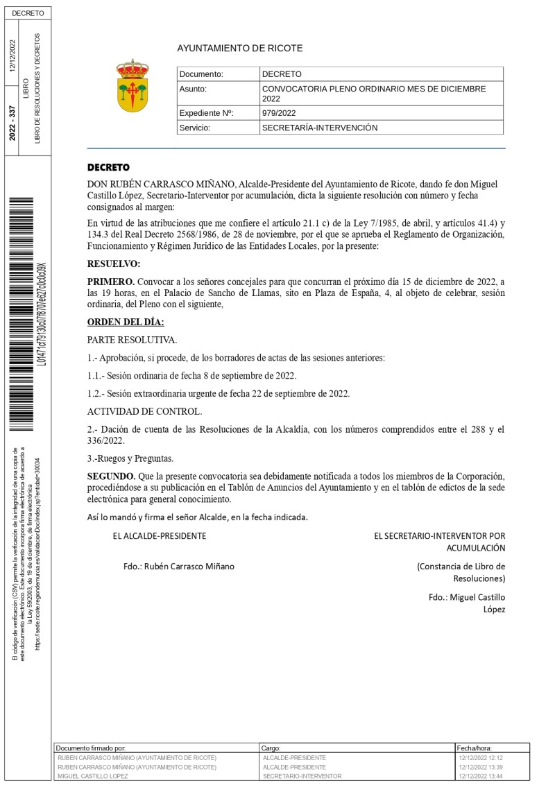 CONVOCATORIA PLENO ORDINARIO 15/12/2022