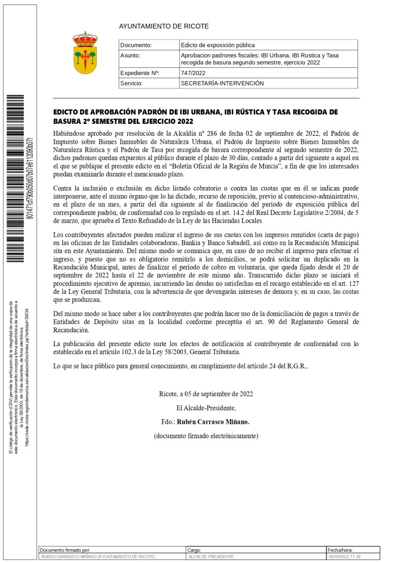 EDICTO DE APROBACIÓN PADRÓN DE IBI URBANA, IBI RÚSTICA Y TASA RECOGIDA DE BASURA 2º SEMESTRE DEL EJERCICIO 2022 Publicado en el Borm en fecha 14/09/2022. Comparte en FacebookTweet