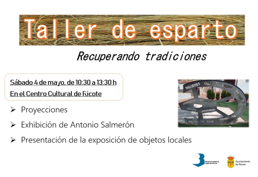 El próximo sábado, día 4 de mayo, a las 12 horas se presentará la exposición “El esparto en Ricote: recuperando tradiciones” en el Centro Cultural Sancho de Llamas. El contenido de la exposición proviene de aportaciones locales. Además, habrá una muestra/taller durante toda la mañana a cargo de Antonio José Salmerón.