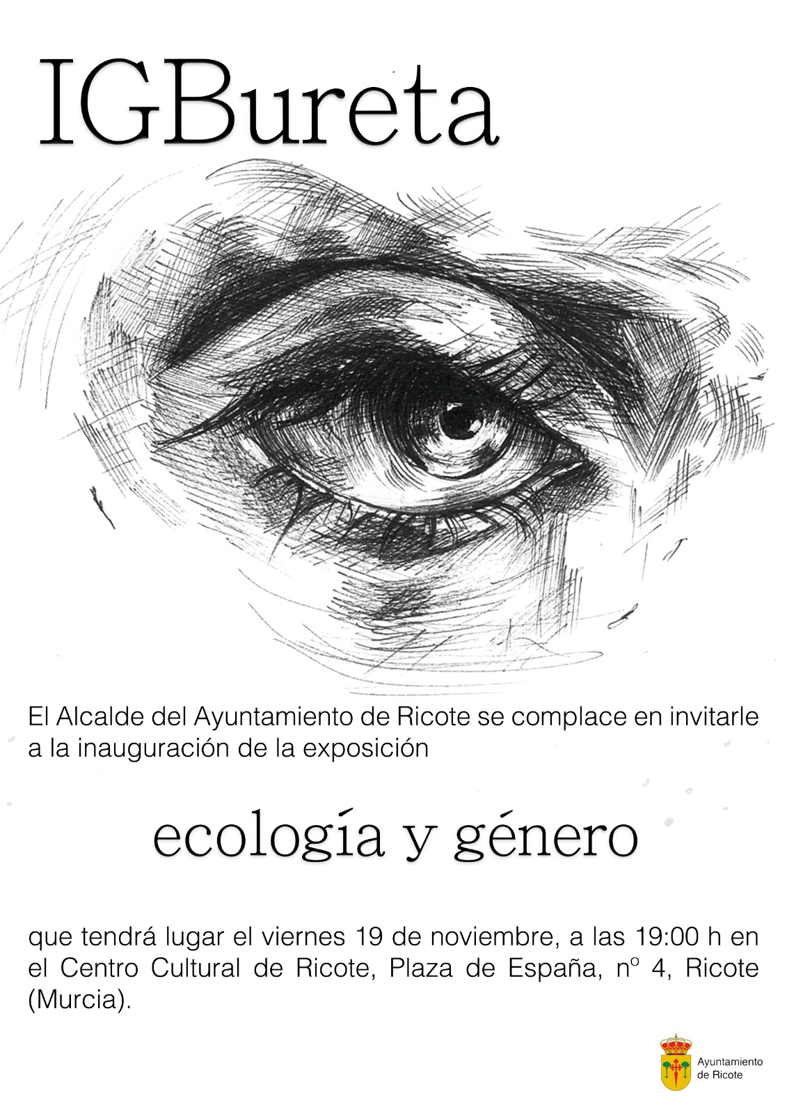 El viernes 19 de noviembre se llevará a cabo la inauguración de la exposición ecología y género, de la artista María Isabel García Bureta. Será a las 19 horas, en el Centro Cultural de Ricote (Plaza de España, 4).