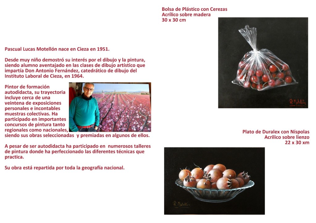 Pascual Lucas es un pintor ciezano que a lo largo de los años ha perfeccionado su técnica y nos muestra en esta exposición un conjunto de obras que nos acercan a nuestra agricultura y a sus productos de una forma realista.