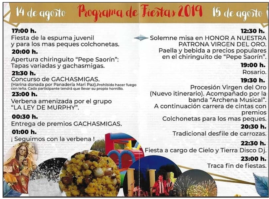 Los próximos días 14 y 15 de agosto se celebrarán las fiestas en honor a la Virgen del Oro de Charrara. Contaremos con verbena tradicional, fiesta de la espuma, desfile de carrozas y muchas más actividades que no puedes perderte.