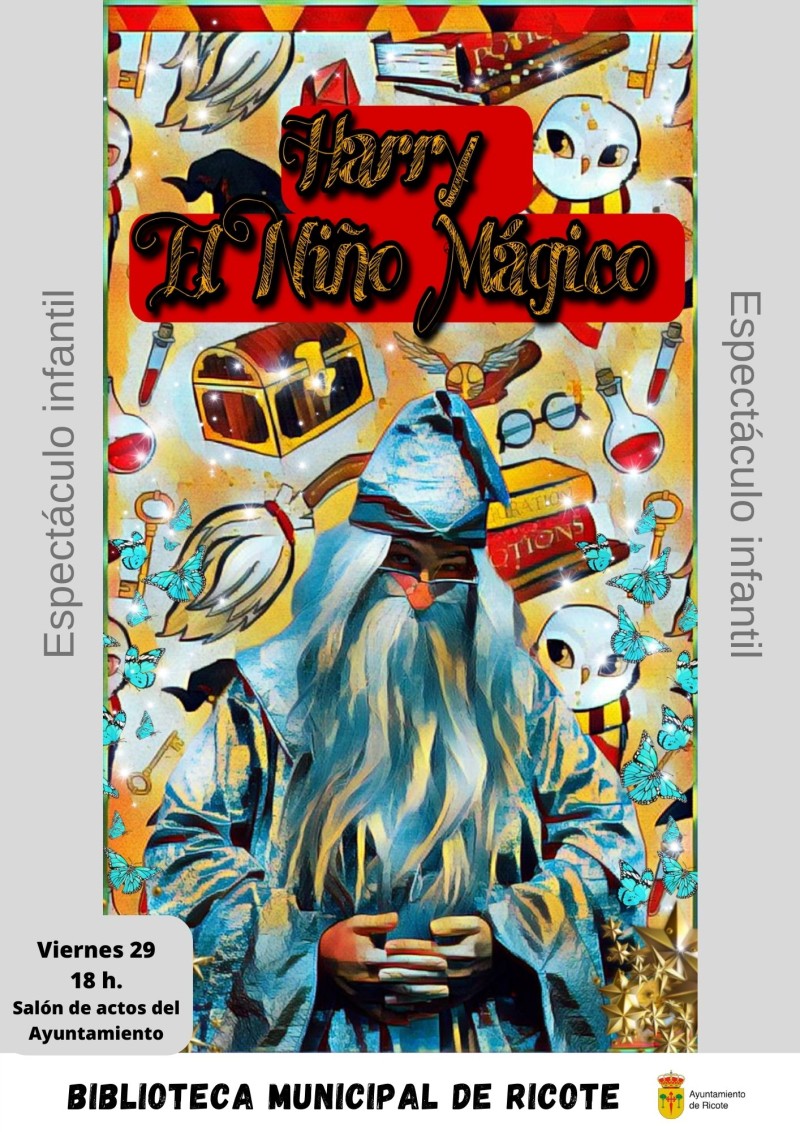 Harry, el niño mágico El viernes 29 de abril, y dentro de los actos de celebración del Día del Libro, habrá un espectáculo infantil titulado “Harry, el niño mágico”. Será en el salón de actos del Ayuntamiento, a las 18 h. Comparte en FacebookTweet
