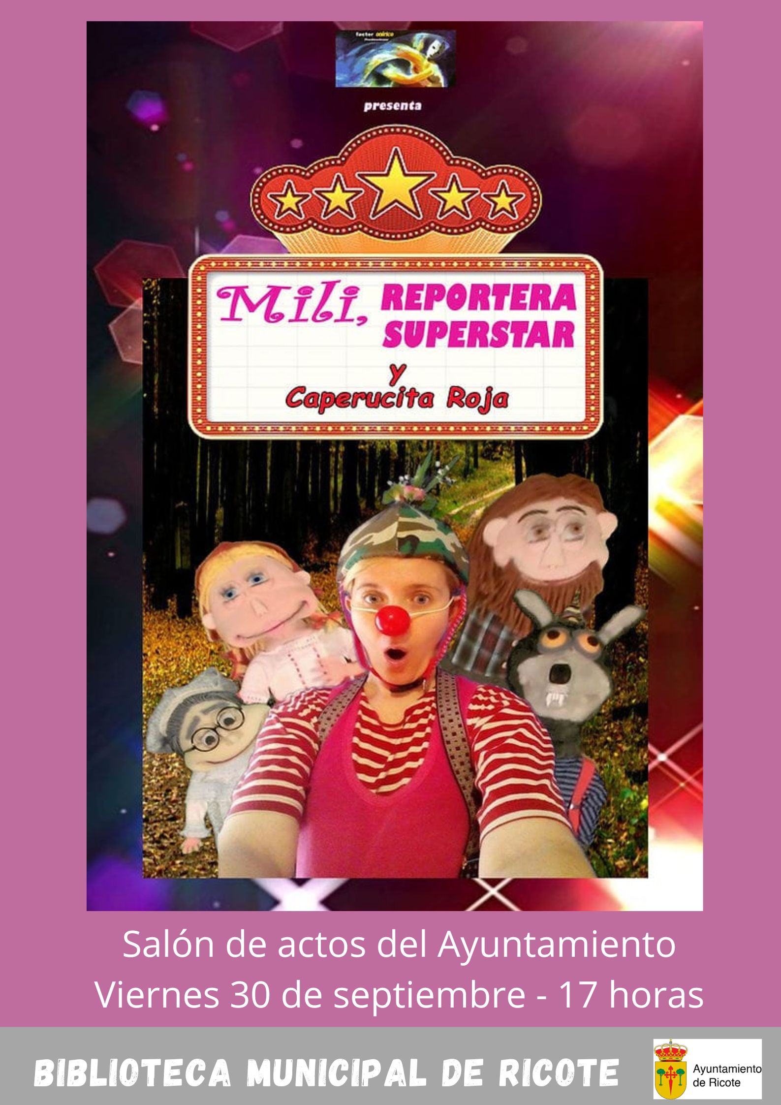 El próximo viernes 30 de septiembre a las 17 h. en el salón de actos del Ayuntamiento, habrá un espectáculo infantil titulado “Mili, reportera superstar y Caperucita Roja”, a cargo de Factor Onírico.