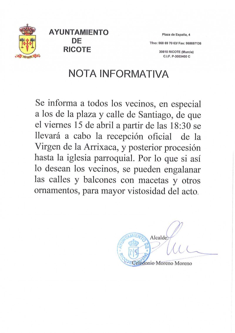 NOTA INFORMATIVA RECEPCIÓN OFICIAL VIRGEN DE LA ARRIXACA