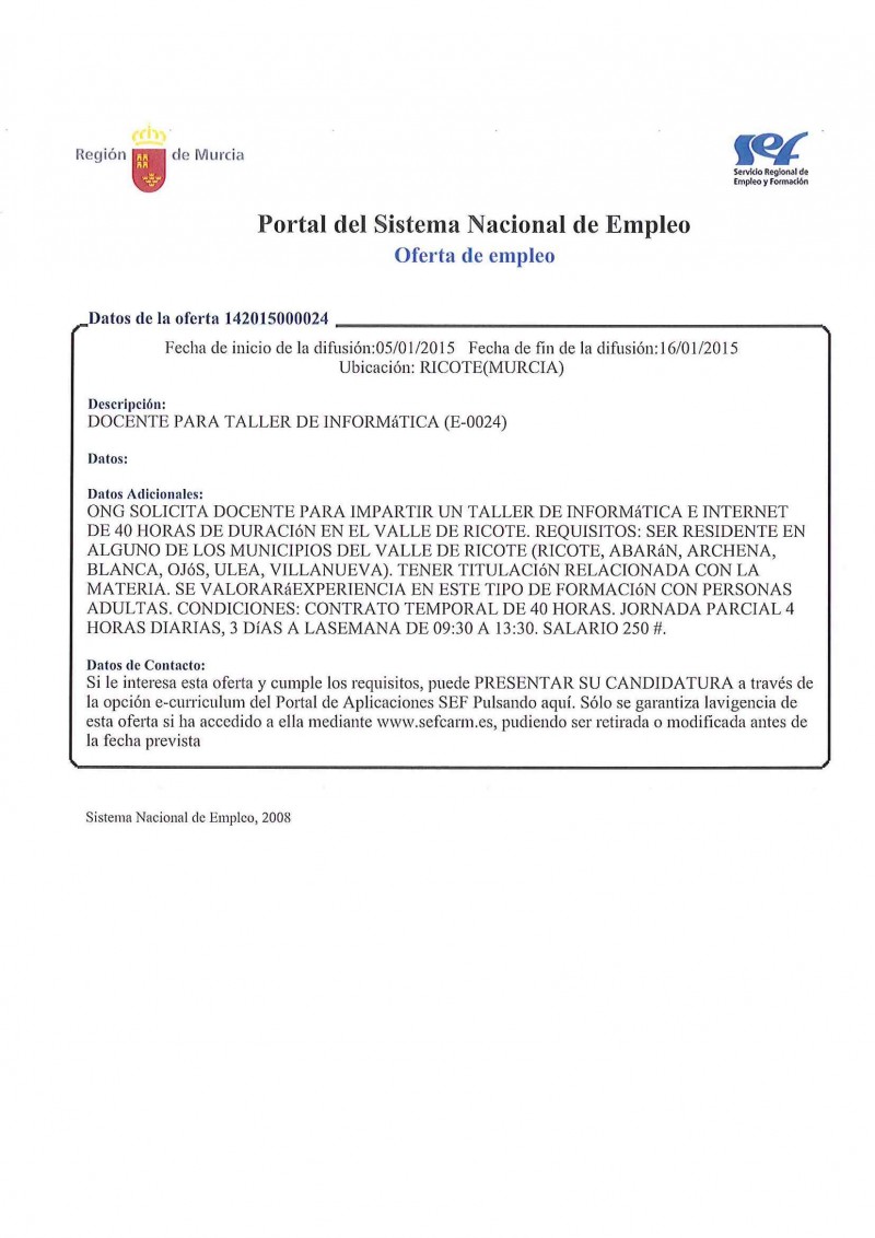 OFERTA DE EMPLEO DOCENTE PARA TALLER DE INFORMATICA