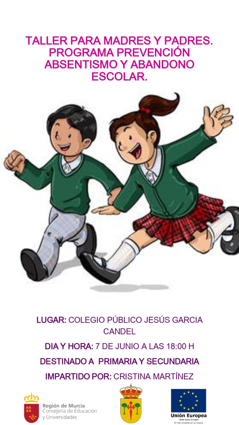 El próximo viernes 7 de junio a las 18:00 horas, se realizará en el CEIP Jesús García Candel un taller para padres y madres que tendrá como objetivo la prevención del absentismo y el abandono escolar.