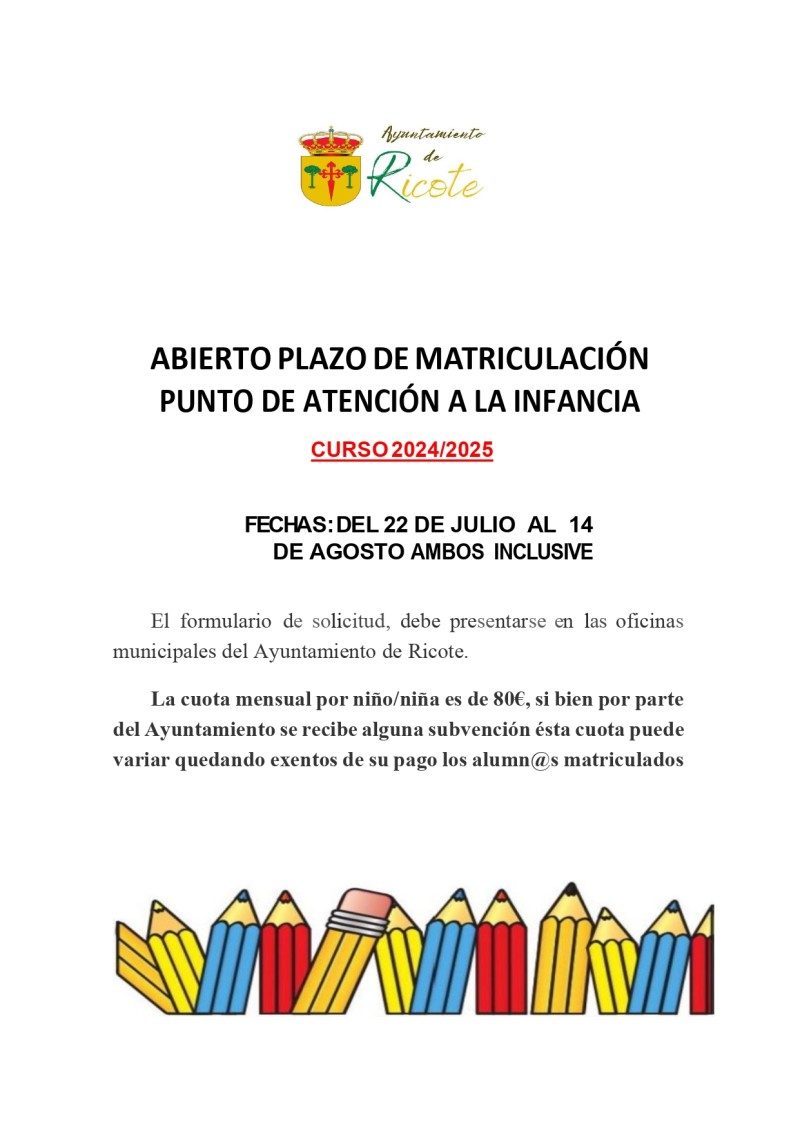 ABIERTO PLAZO DE MATRICULACIÓN PUNTO DE ATENCIÓN A LA INFANCIA RICOTE matricula 24-25 Comparte en FacebookTweet