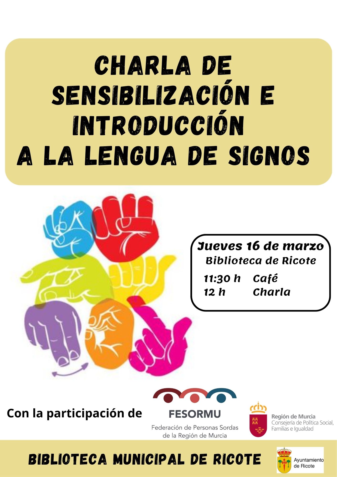 El próximo jueves 16 de marzo habrá una actividad de concienciación y sensibilización con la comunidad sorda. En colaboración con la Federación de Personas Sordas de la Región de Murcia (FESORMU), habrá un encuentro en el que se nos mostrará la situación de las personas sordas y sus barreras de comunicación, donde se nos introducirá en la de lengua de signos.