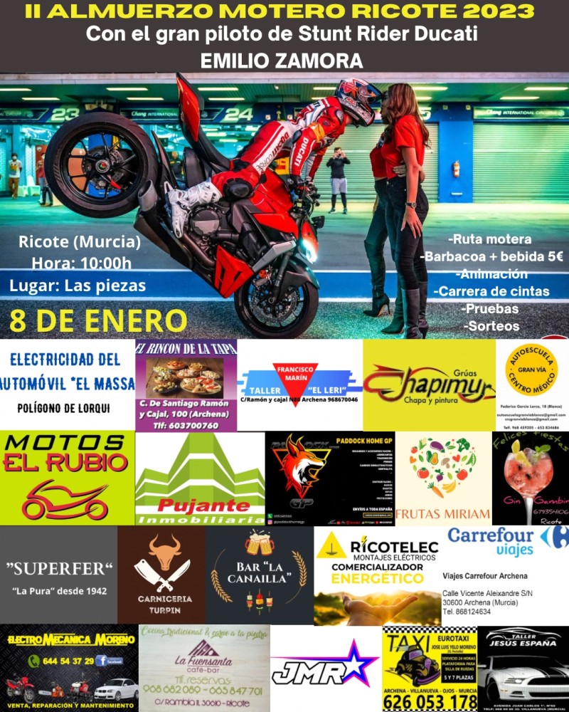 II ALMUERZO MOTERO EN RIICOTE, CON EL PILOTO DE STUNT RIDER DUCATI EMILIO ZAMORA 8 DE ENERO A LAS 10:00