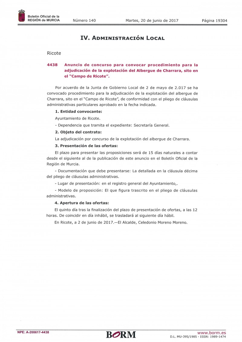 ANUNCIO CONCURSO ADJUDICACIÓN EXPLOTACIÓN ALBERGUE DE CHARRARA
