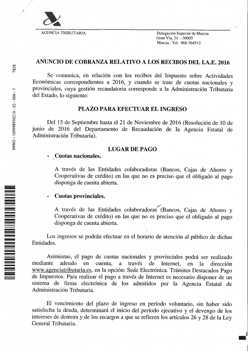 ANUNCIO DE COBRANZA RELATIVO A LOS RECIBOS DEL I.A.E. 2016
