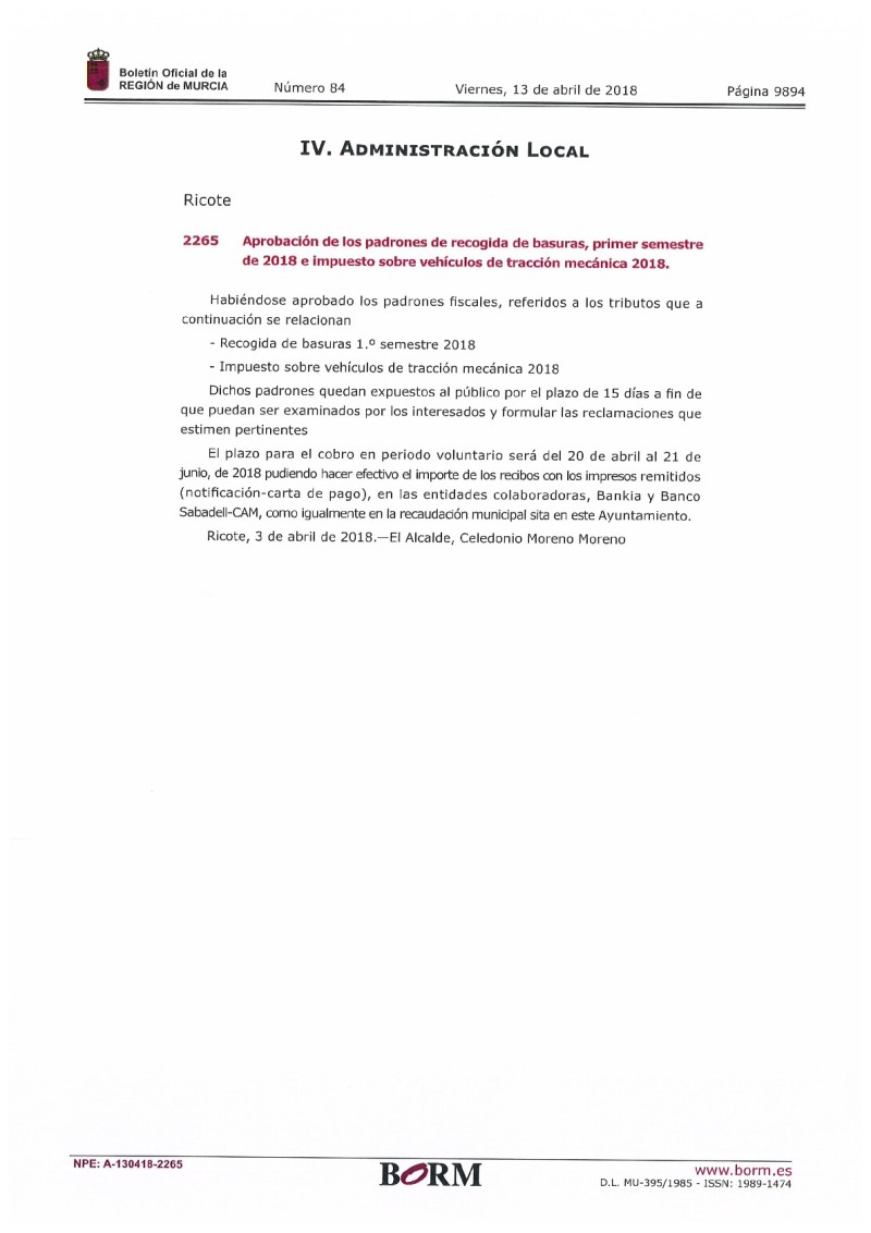 APROBACIÓN DE LOS PADRONES RECOGIDA DE BASURAS E IMPUESTO VEHÍCULOS 2018