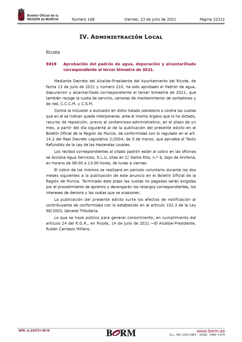 Aprobación del padrón de agua, depuración y alcantarillado correspondiente al tercer bimestre de 2021. Comparte en FacebookTweet