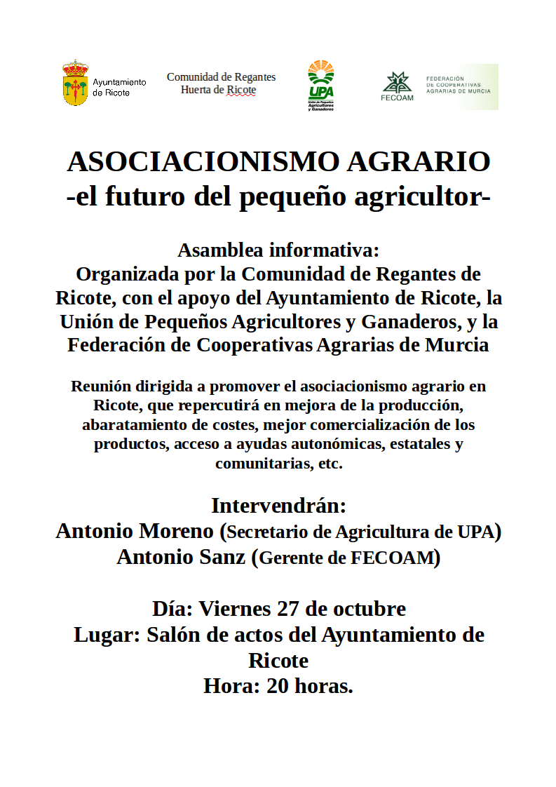 El próximo viernes, 27 de octubre, organizado por la Comunidad de regantes y con el apoyo de la Unión de Pequeños Agricultores y Ganaderos, la Federación de Cooperativas Agrarias de Murcia, y el Ayuntamiento de Ricote, tendrá lugar una asamblea informativa a las 20 horas en el Salón de actos del Ayuntamiento para informar sobre este tema y fomentar el asociacionismo agrario en Ricote.