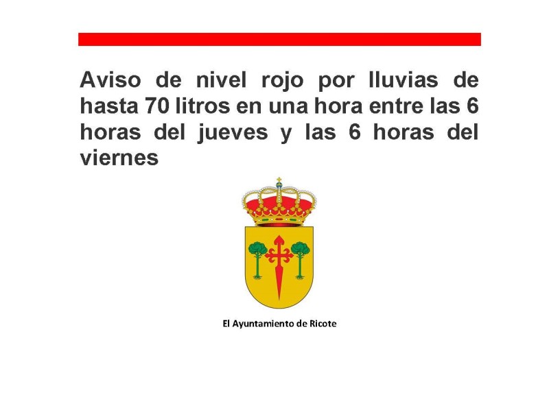 El Ayuntamiento de Ricote pone en conocimiento de los vecinos que la Agencia Estatal de Meteorología ha emitido avisos de fenómenos meteorológicos adversos de nivel rojo por lluvias que pueden alcanzar los 70 litros por metro cuadrado en una hora y los 200 litros por metro cuadrado en 12 horas en toda la Región de Murcia, entre las 6 de la mañana del jueves y las 6 de la mañana del viernes. Se esperan las precipitaciones más intensas durante la tarde y noche de mañana jueves y la madrugada del viernes.