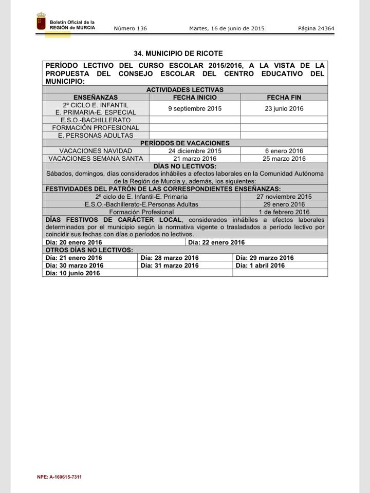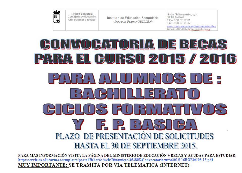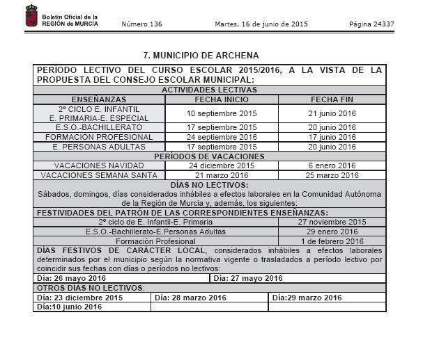 BECAS Y PERIODOS LECTIVOS PARA EL CURSO 2015-2016 INICIO CURSO 2015/16 – BECAS : PINCHA AQUÍ – CALENDARIO LECTIVO DE RICOTE: PINCHA AQUÍ – CALENDARIO LECTIVO DE ARCHENA: PINCHA AQUÍ Comparte en FacebookTweet