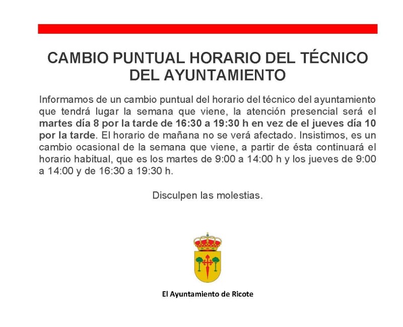Informamos de un cambio puntual del horario del técnico del ayuntamiento que tendrá lugar la semana que viene, la atención presencial será el martes día 8 por la tarde de 16:30 a 19:30 h en vez de el jueves día 10 por la tarde. El horario de mañana no se verá afectado. Insistimos, es un cambio ocasional de la semana que viene, a partir de ésta continuará el horario habitual, que es los martes de 9:00 a 14:00 h y los jueves de 9:00 a 14:00 y de 16:30 a 19:30 h.
