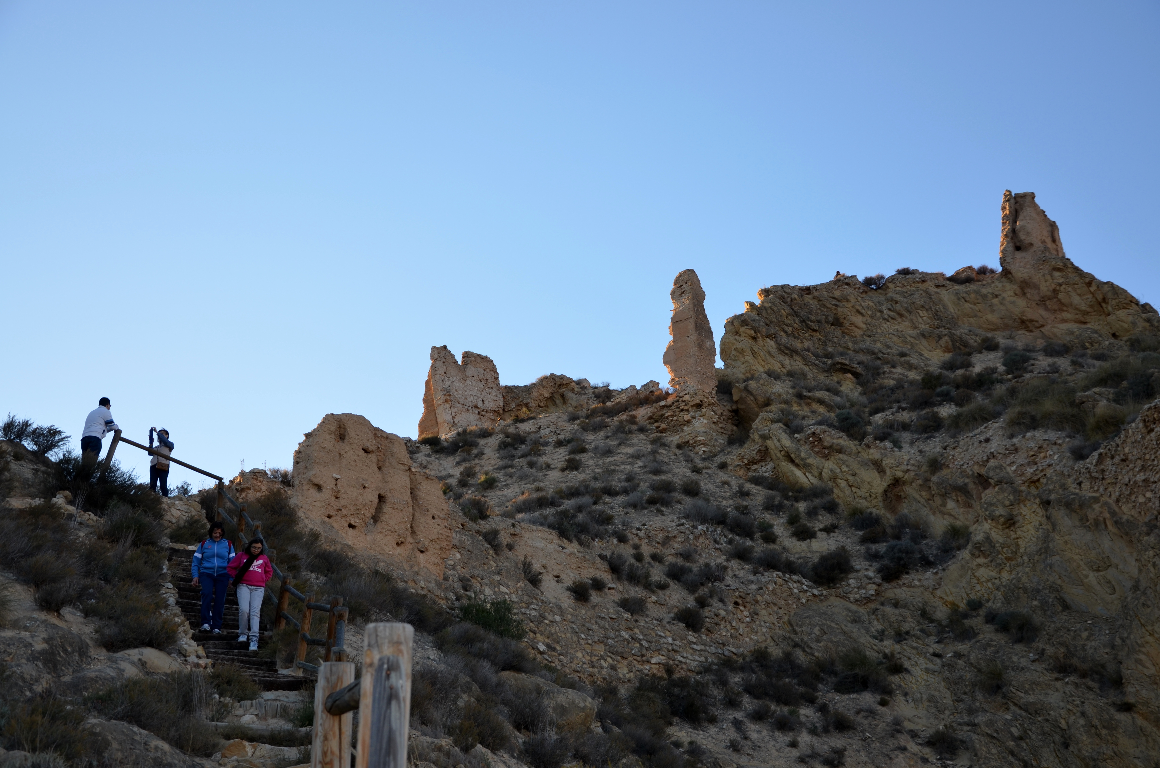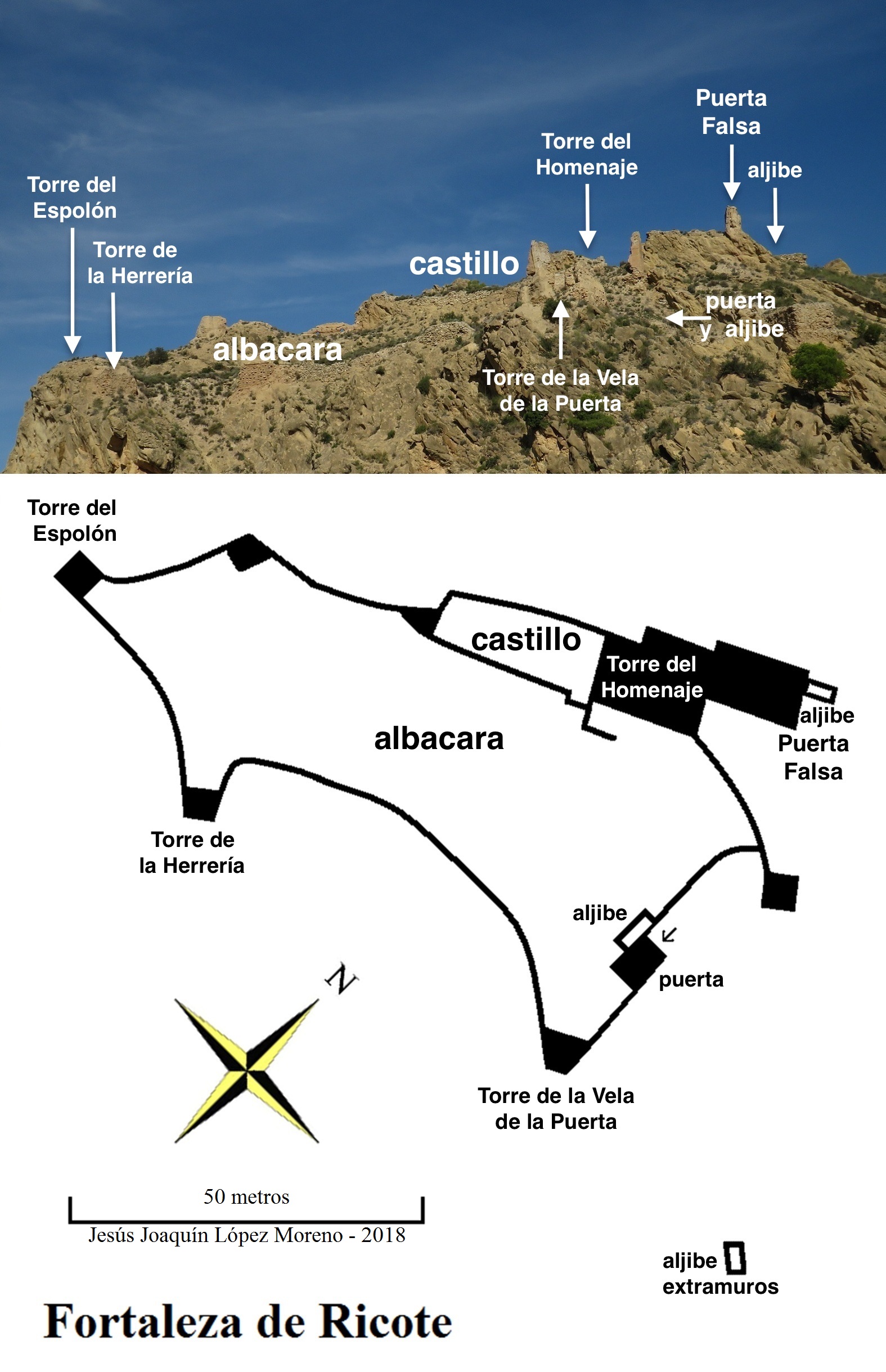 Extremando la precaución, se puede acceder a la fortificación por la puerta acodada. Nos encontramos ante un primer recinto cercado por una muralla adaptada a la orografía del terreno y franqueada por varias torres. Hablamos del llamado “albacar” en el periodo andalusí y empleado por la población de Ricote para protegerse con sus enseres en los momentos de inestabilidad. El otro espacio de la fortaleza es el que vemos en la zona más elevada, llamado “celoquia” y utilizado como residencia del representante de los poderes locales o regionales. Estamos ante la fortaleza cabeza administrativa del Wadi Riqut (Valle de Ricote) en los últimos siglos andalusíes. Por aquel entonces, al-Idrisi (siglo XII) la menciona como “hisn Riqut” en el itinerario de Murcia a Segura.