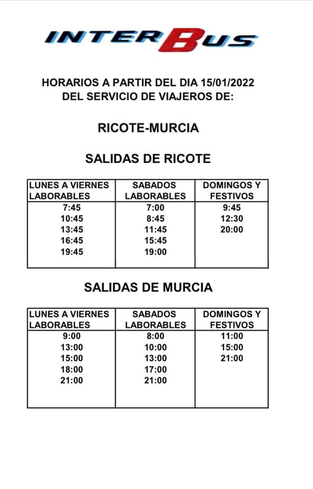 RECTIFICACIÓN: DOMINGOS Y FESTIVOS : SALIDAS DE RICOTE: 9.45 12.30 19.45 ( EN LUGAR DE LAS 20.00) TODAS LAS SALIDAS SÁBADOS LABORALES, DOMINGOS Y FESTIVOS SE …