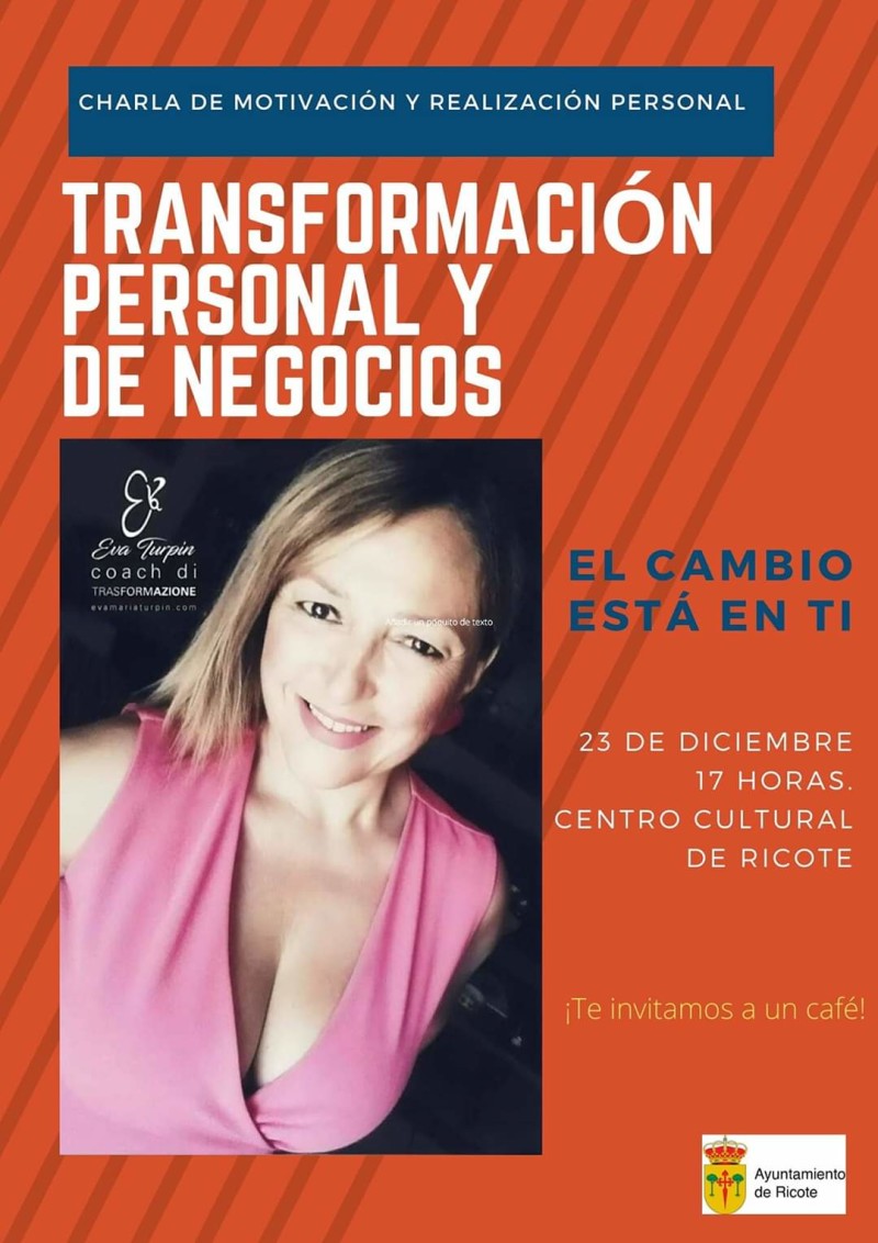 El día 23 de diciembre a las 17:00 horas, en el Centro Cultural de Ricote, podréis disfrutar de una charla sobre motivación y realización personal “Transformación Personal y de Negocios” con las que nos deleitará la Coach Eva María Turpín.