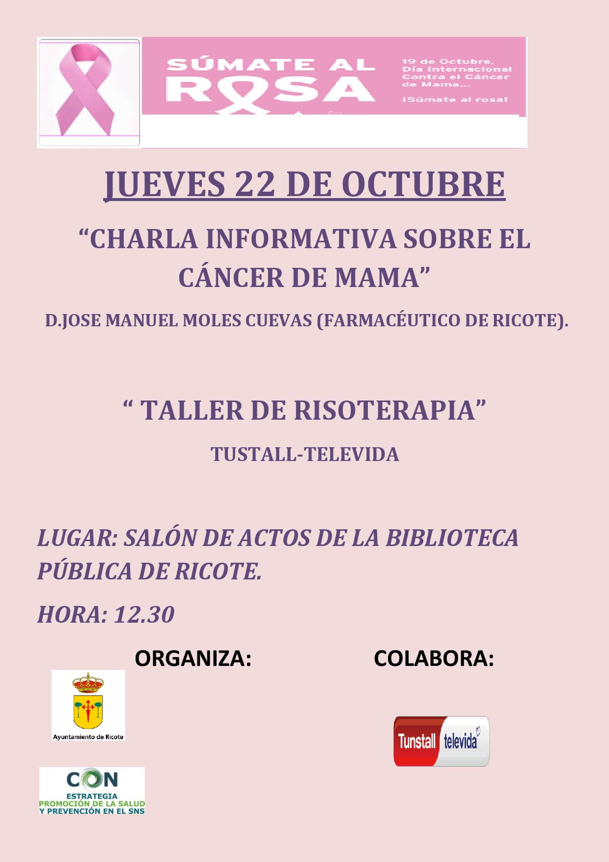 CHARLA PREVENCIÓN CÁNCER DE MAMA Y TALLER DE RISOTERAPIA JUEVES 22 DE OCTUBRE 12.30 HORAS BIBLIOTECA PÚBLICA DE RICOTE MÁS INFOR. Comparte en FacebookTweet
