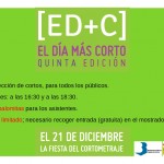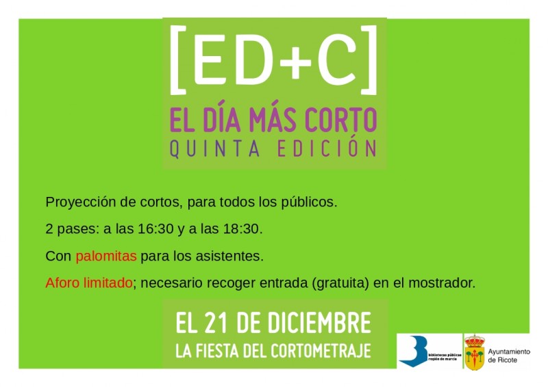 El jueves 21 es el día más corto del año, así que aprovechamos ese motivo y nos unimos a la iniciativa “El día más corto”. Realizaremos una proyección de cortometrajes (películas entre 2 y 9 minutos de duración), con especial atención al público infantil.