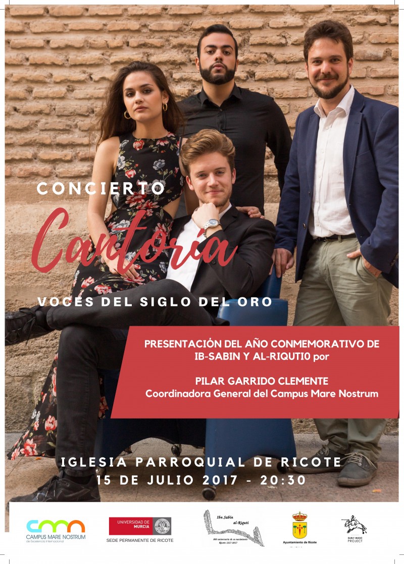El concierto correrá a cargo de Cantoría, un joven conjunto vocal especializado en la música del Renacimiento que pese a su juventud tiene amplia proyección nacional e internacional. El repertorio de Cantoría se basa principalmente en la música del Siglo de Oro Español y el Renacimiento Italiano. Para esta ocasión interpretarán un atractivo programa basado en una recopilación de la música más representativa de los cancioneros españoles.