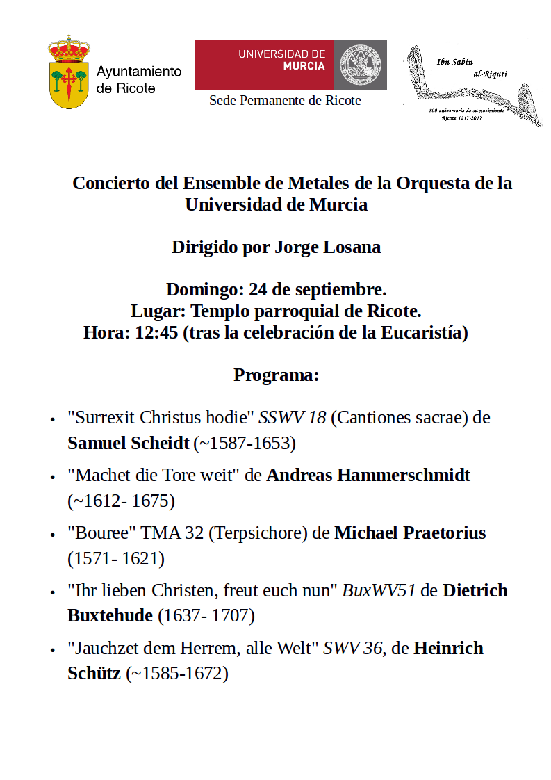 Este concierto es posible gracias al acuerdo establecido entre la Universidad de Murcia y el Ayuntamiento de Ricote por el que nuestro pueblo es Sede Permanente de la Universidad.