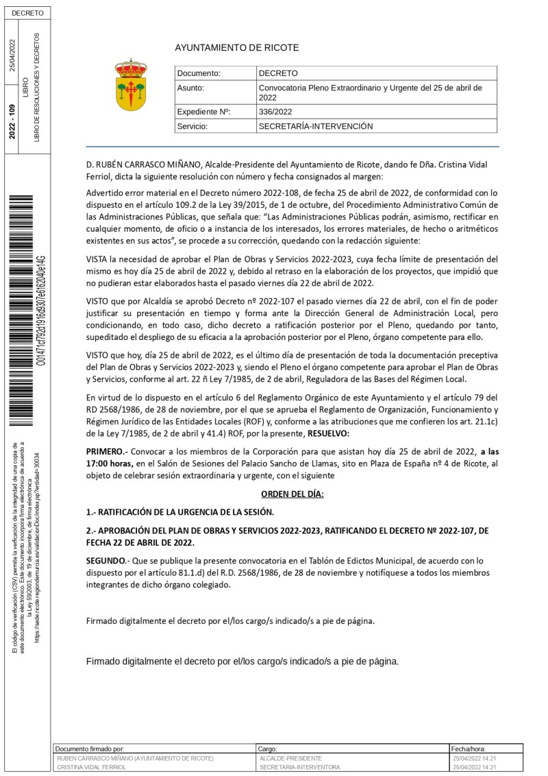 Convocatoria Pleno Extraordinario y Urgente día 25 de abril de 2022
