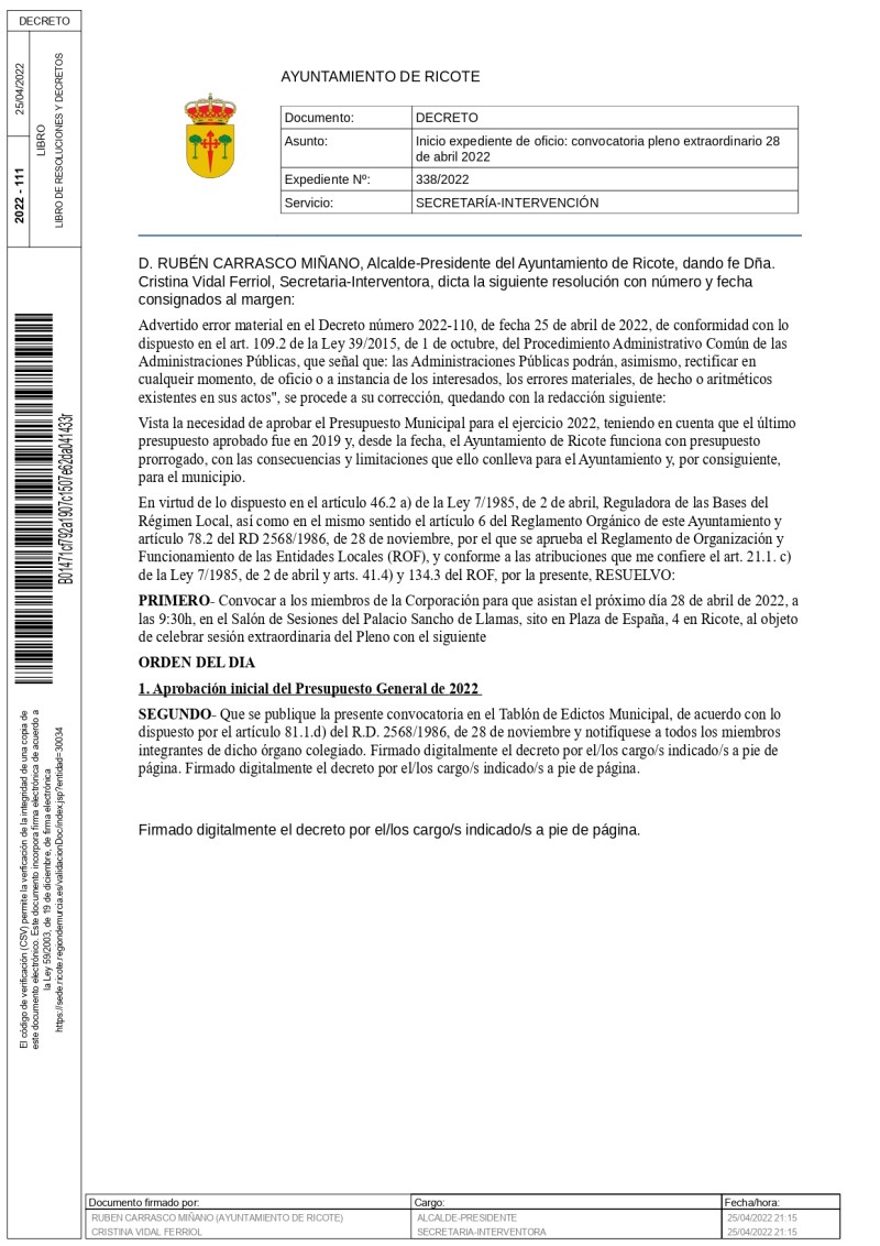 Decreto convocatoria Pleno extraordinario 28 abril 2022
