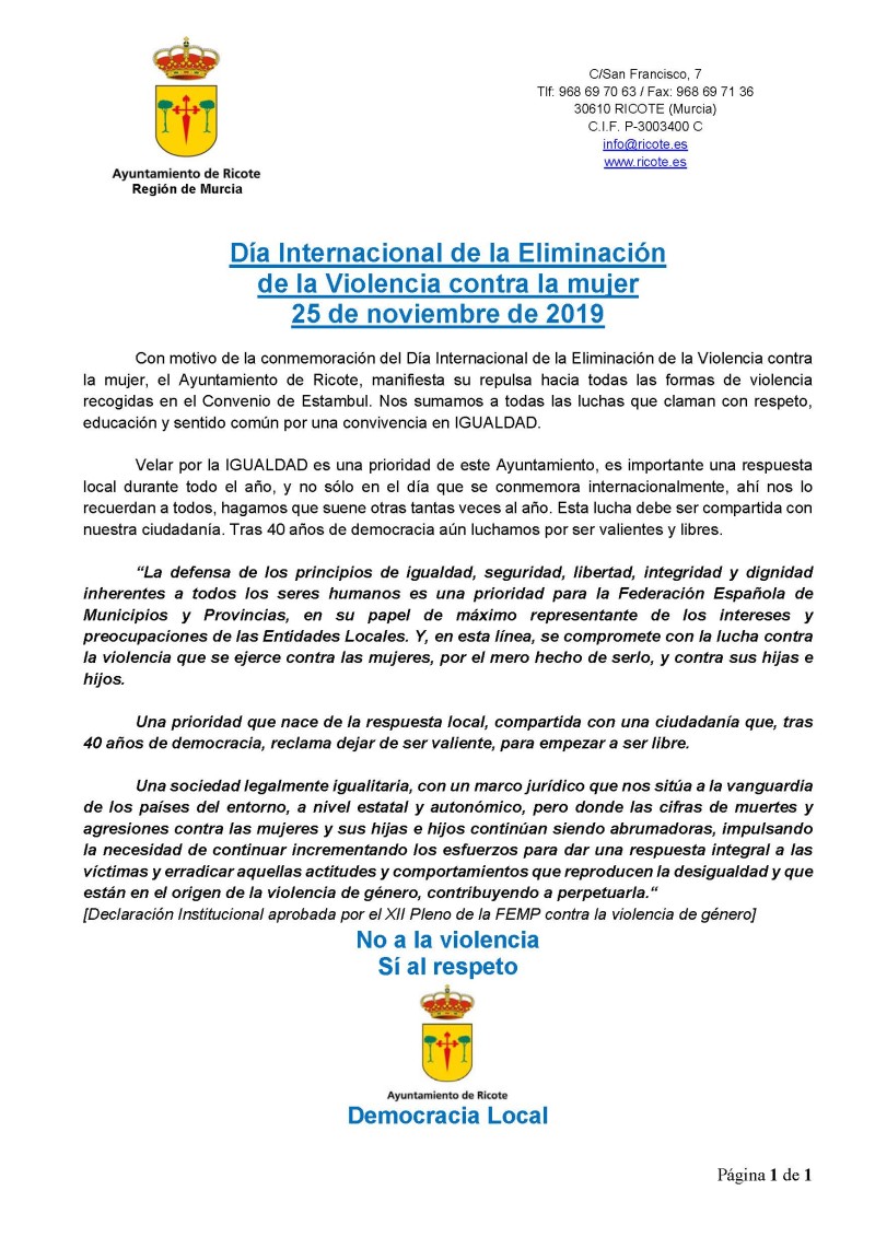 Con motivo de la conmemoración del Día Internacional de la Eliminación de la Violencia contra la mujer, el Ayuntamiento de Ricote, manifiesta su repulsa hacia todas las formas de violencia recogidas en el Convenio de Estambul. Nos sumamos a todas las luchas que claman con respeto, educación y sentido común por una convivencia en IGUALDAD.