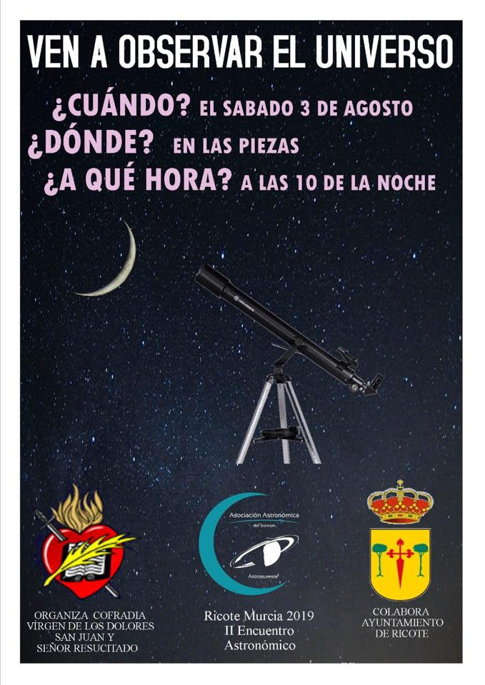 Por segundo año consecutivo el Ayuntamiento de Ricote colabora con la Cofradía Virgen de los Dolores, San Juan y Señor Resucitado en el II Encuentro Astronómico que se realizará el próximo sábado 3 de agosto a partir de las 22:00 horas en las Piezas.