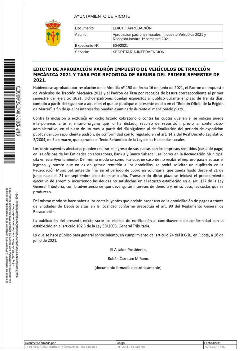 EDICTO APROBACIÓN PADRÓN IMPUESTO DE VEHÍCULOS Y BASURA