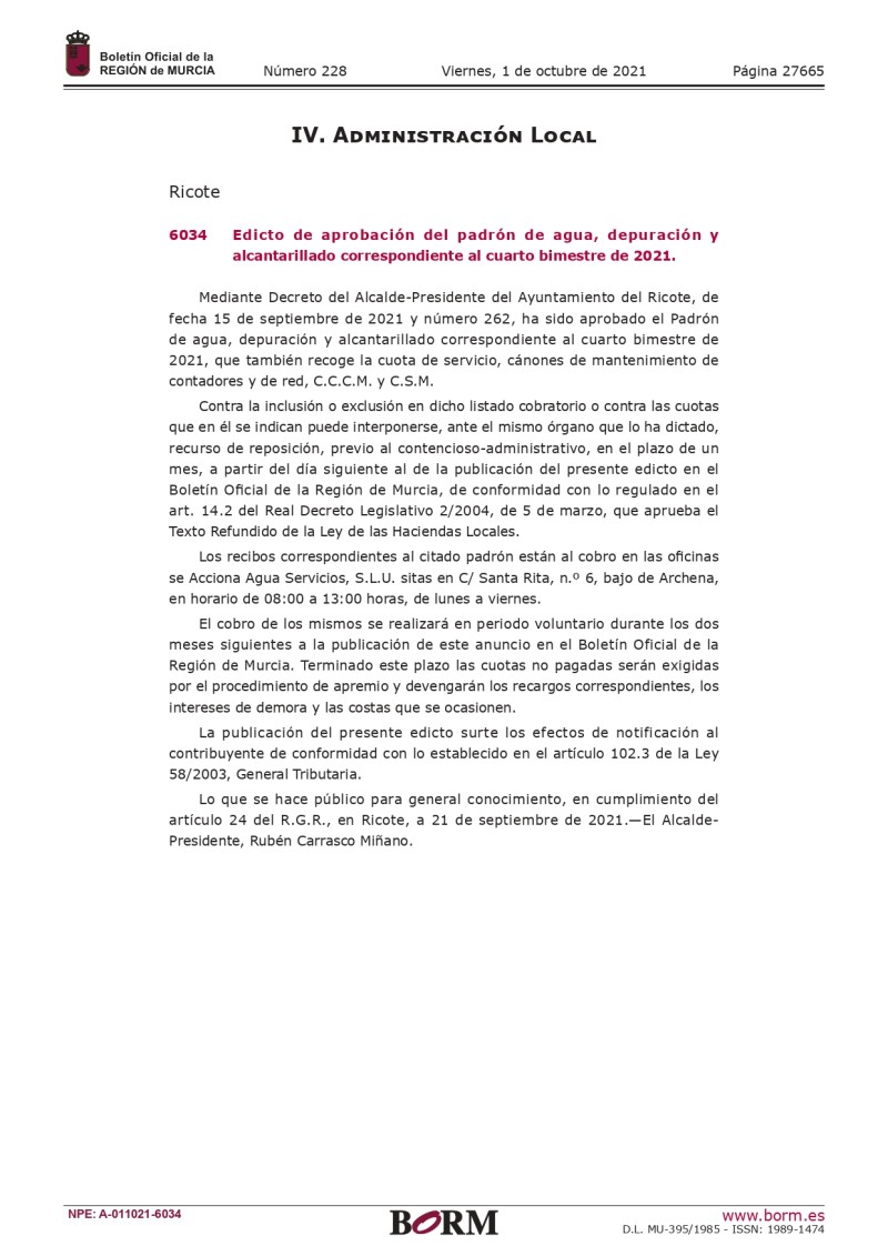 Edicto de aprobación del padrón de agua, depuración y alcantarillado correspondiente al cuarto bimestre de 2021. Comparte en FacebookTweet