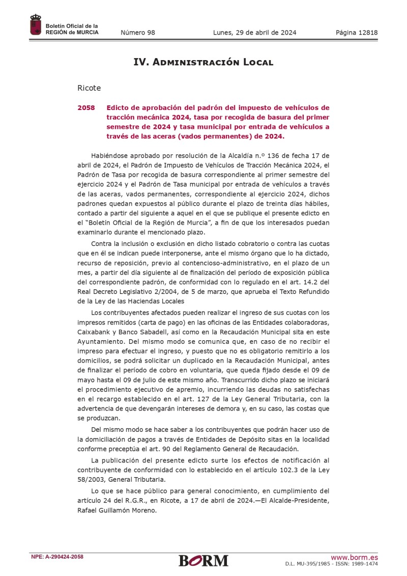 Edicto de aprobación del padrón del impuesto de vehículos de tracción mecánica 2024, tasa por recogida de basura del primer semestre de 2024 y tasa municipal por entrada de vehículos a través de las aceras (vados permanentes) de 2024.