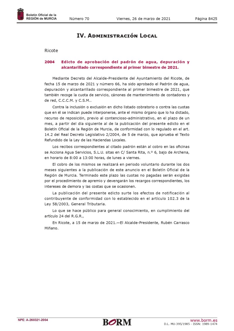 APROBACIÓN DE NUEVAS ORDENANZAS COMUNIDAD DE REGANTES DE LA HUERTA DE RICOTE