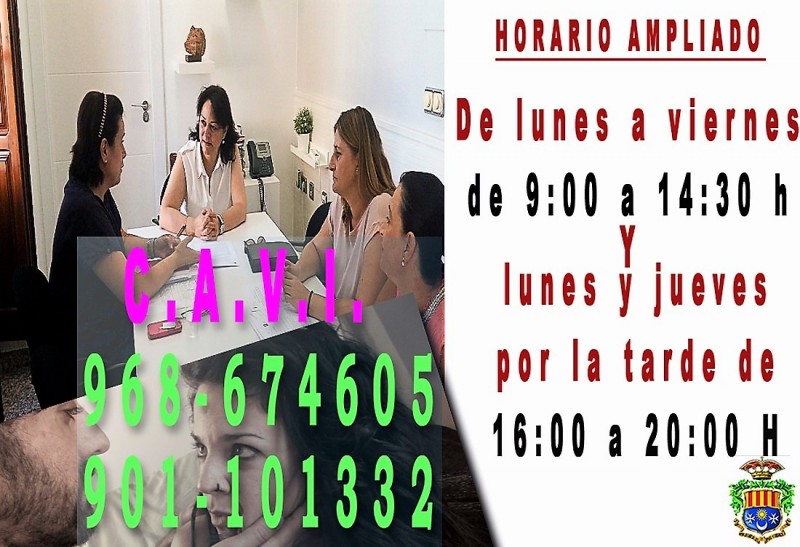 El Centro de Atención Especializada a Mujeres Víctimas de Violencia de Género (CAVI), ubicado en Archena y que da cobertura al Valle de Ricote (Ulea, Ojós, Villanueva del Río Segura, Ricote y Archena) amplia su horario de atención al público:
