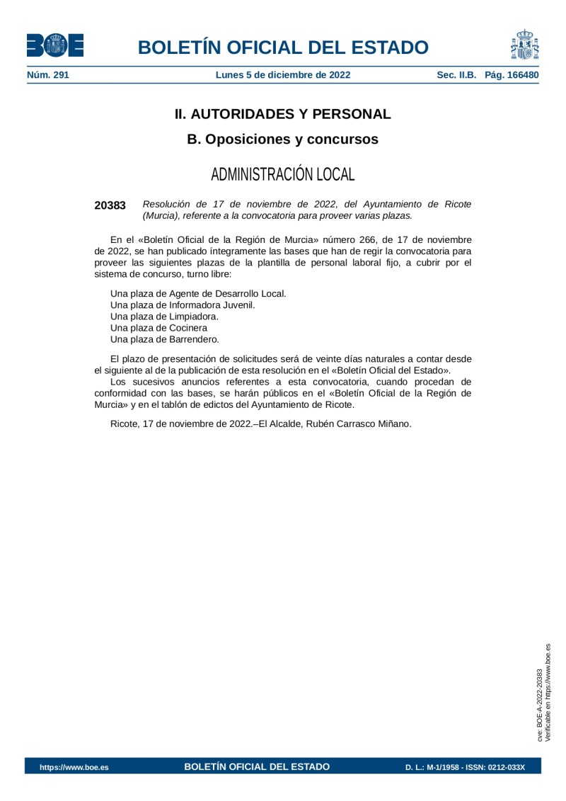 SE INFORMA DE LA RESOLUCION DEL AYUNTAMIENTO DE RICOTE REFERENTE A LA CONVOCATORIA PARA PROVEER VARIAS PLAZAS PARA ESTABILIZACION DE EL EMPLEO TEMPORAL.