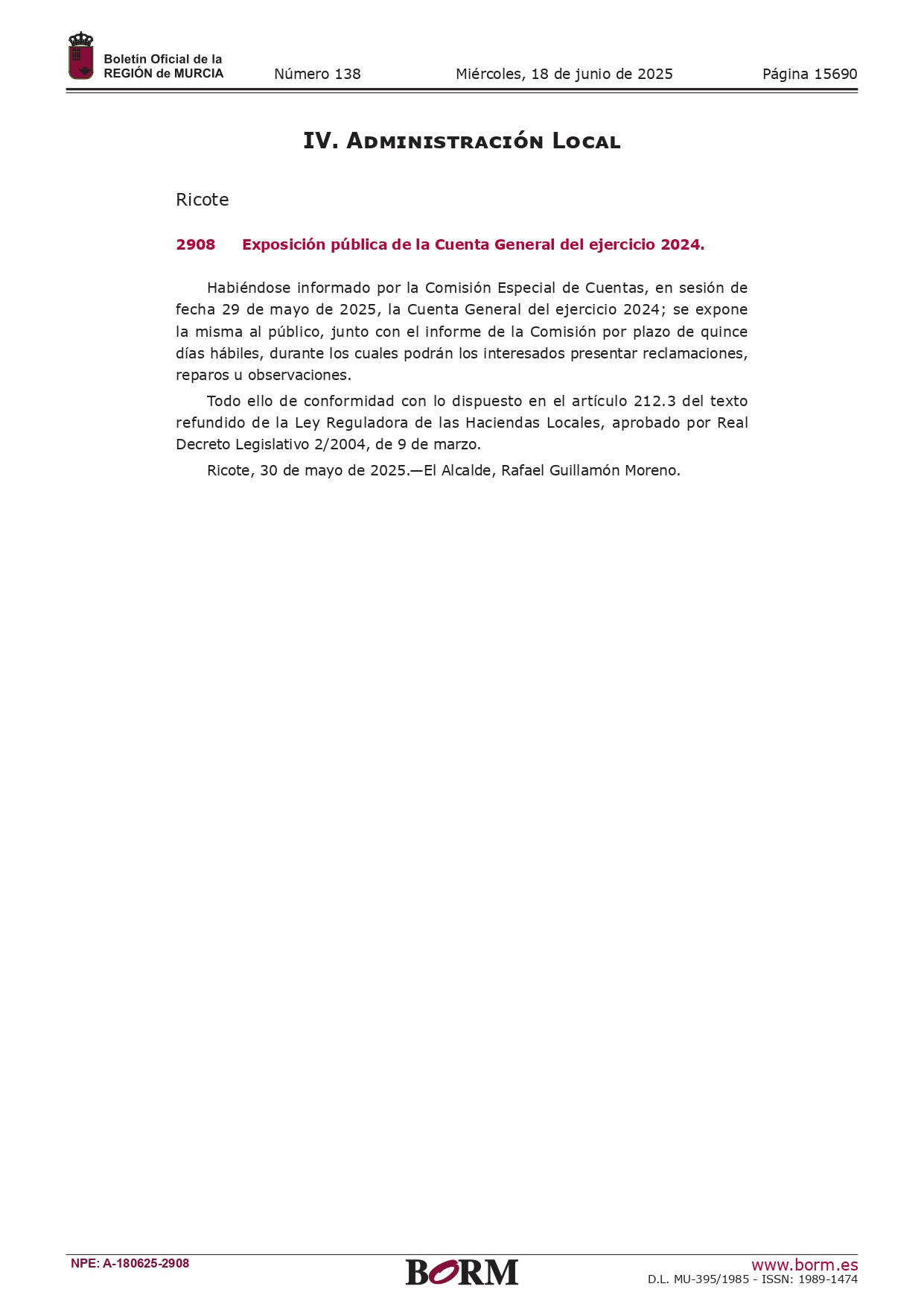 Exposición pública de la Cuenta General del ejercicio 2024. DESCARGAR: Exposición pública de la Cuenta General del ejercicio 2024 Comparte en FacebookTweet