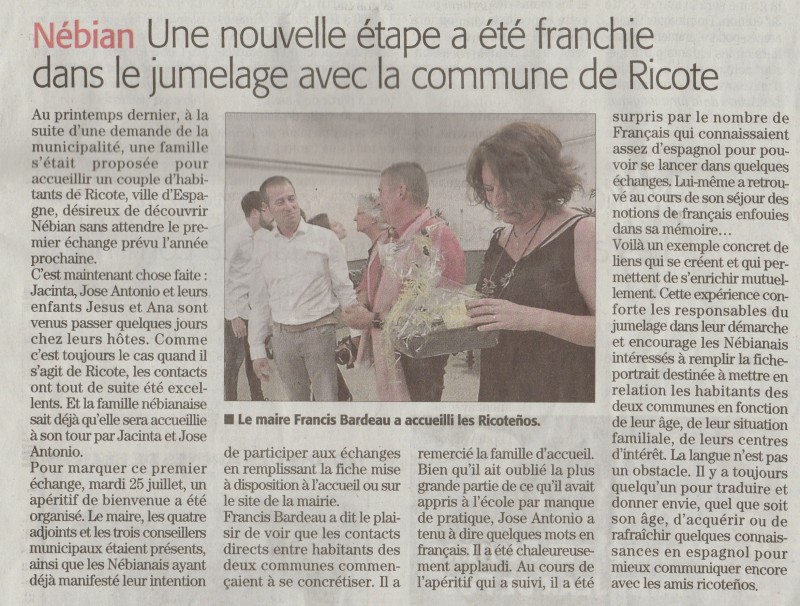 Durante la última semana de julio se realizó el primer intercambio entre familias de Ricote y Nébian. El primer paso lo ha dado la familia de Jacinta Guillamón y José Antonio Sánchez, con sus hijos Ana y Jesús, los cuales fueron acogidos en casa de una familia de la hermana población de Nébian.